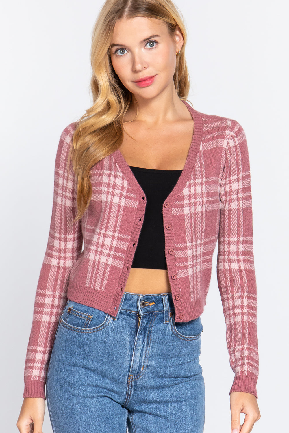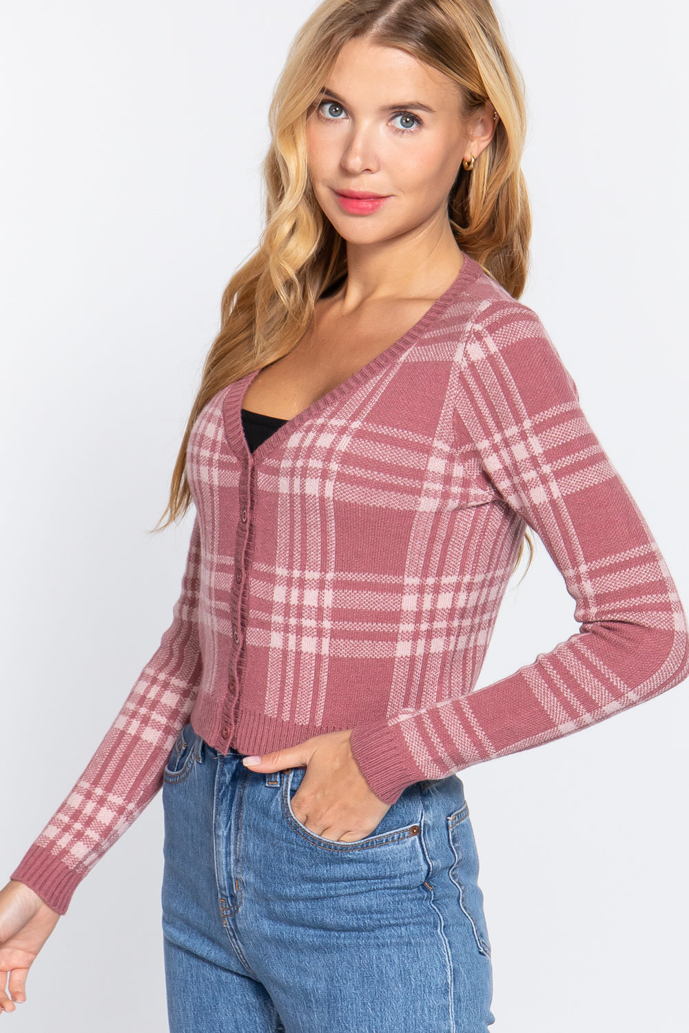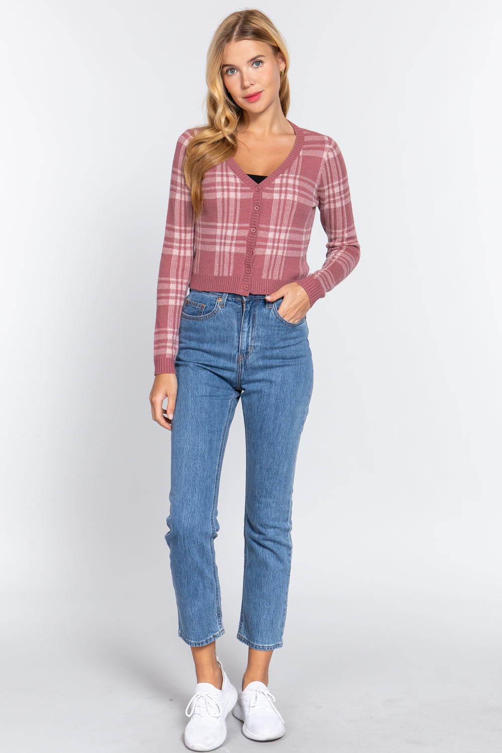 LONG SLEEVE V-NECK FITTED BUTTON DOWN PLAID SWEATER CARDIGAN