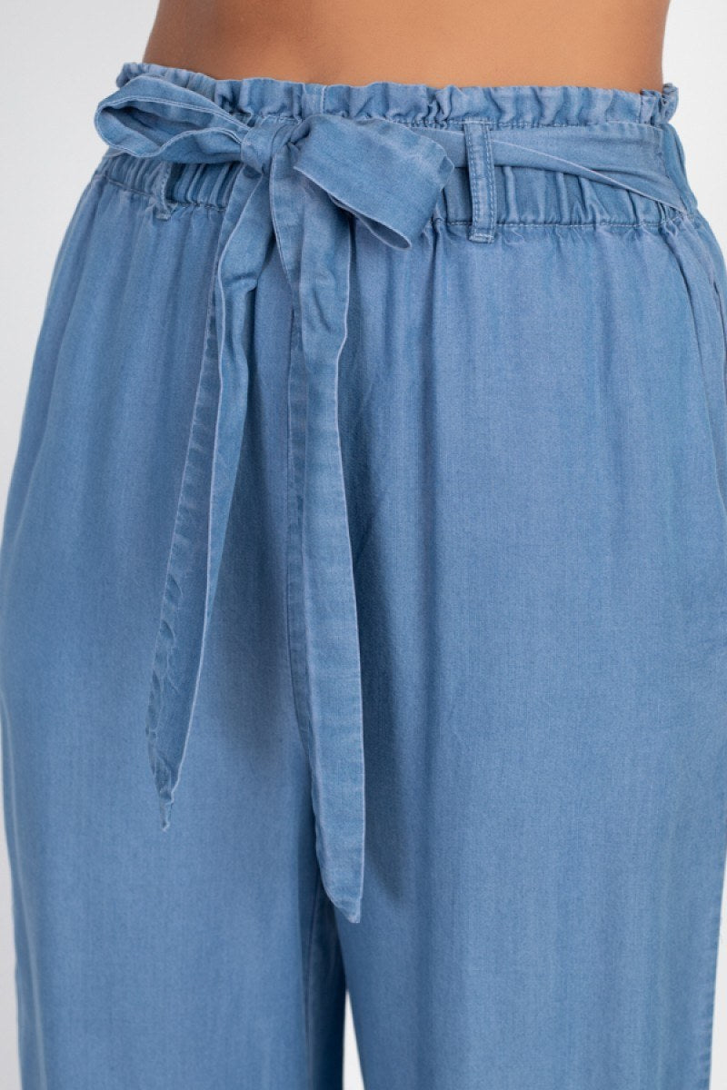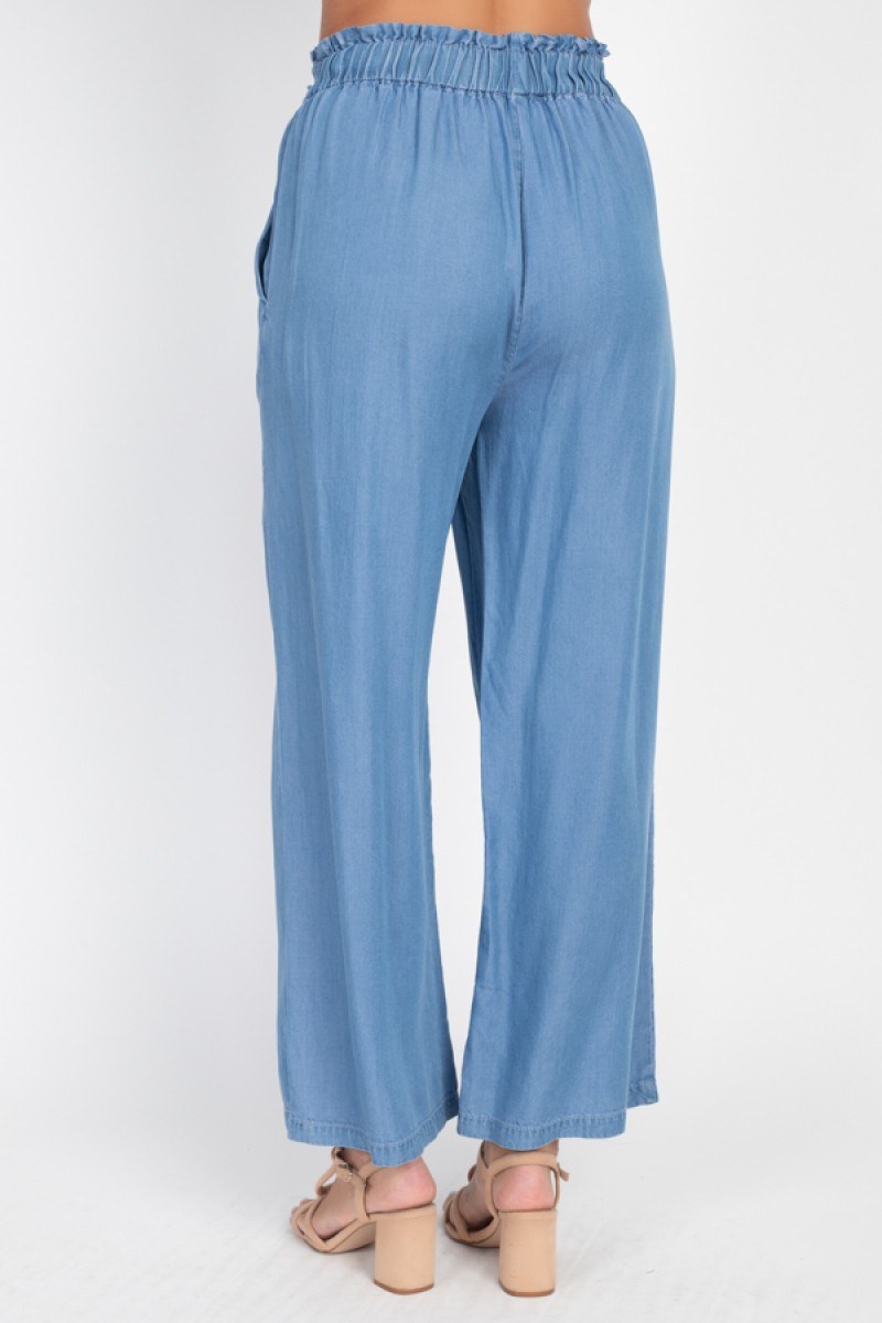 Imported S.M.L A woven pair of pants featuring a denim wash, an elastic waist, waist tie, and a wide leg fit. 100% Lyocell Medium Wash IRI