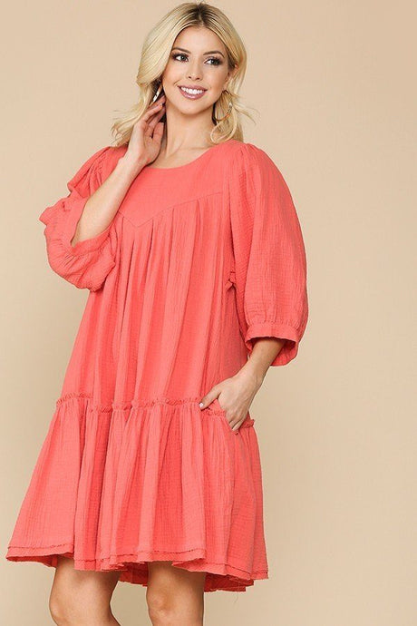 3/4 Sleeve Pocket Ruffle Pintuck Swing Dress