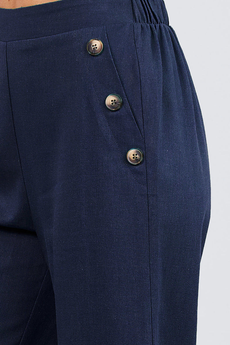 Fake Pocket W/button Detail Wide Long Leg Linen Pants