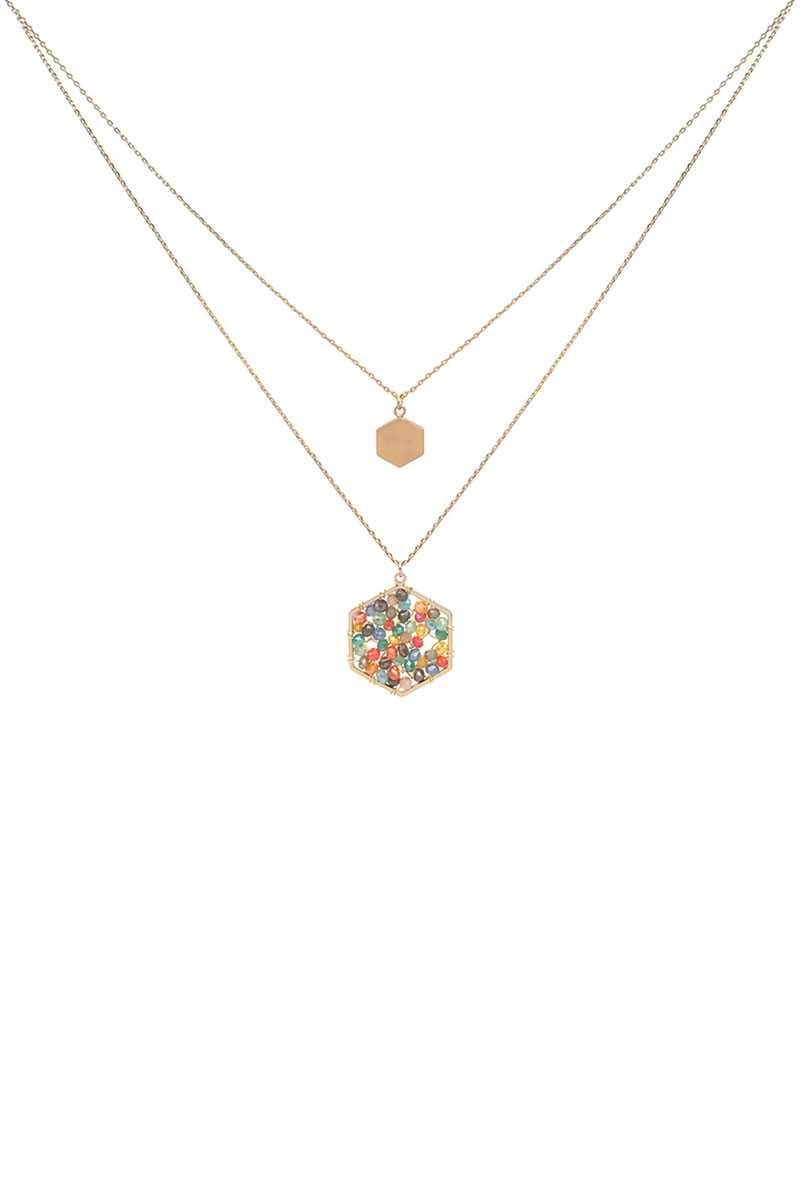 2 LAYERED GLASS BEADED GEOMETRIC PENDANT NECKLACE