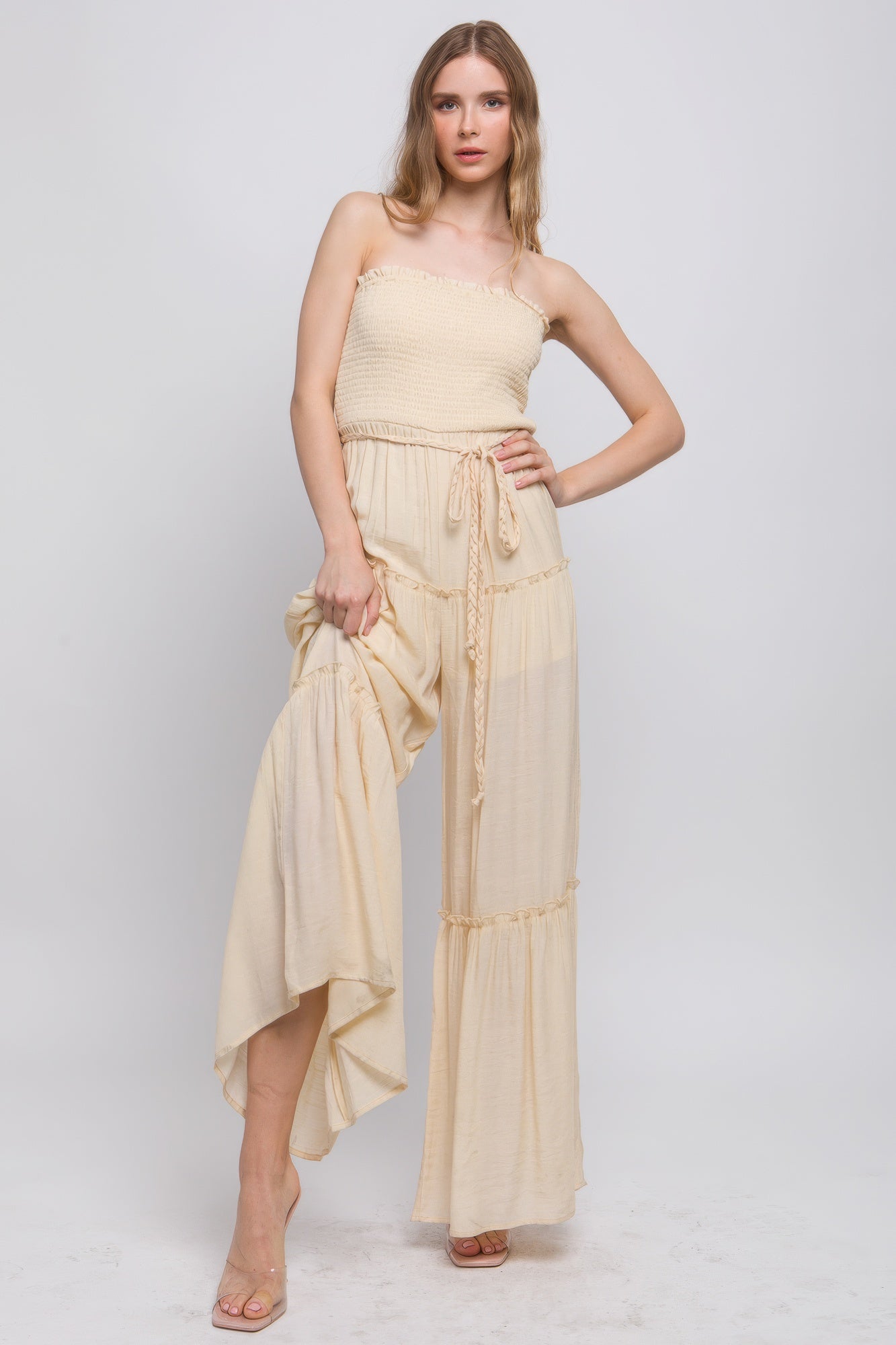Add the Woven Solid Sleeveless Smocked Ruffle Jumpsuit to your cart now and elevate your style effortlessly!